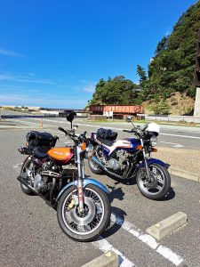 同世代のKawasaki 900RSのオーナーさんも一緒にバイク談義を楽しみます。