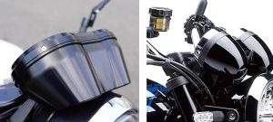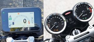 スマホ、ターンバイターン式の簡易ナビもメーター内に表示する、これからの時代これが一番か?ライバルのZ900RSはアナログ2眼の中央にモノクロ反転液晶パネルをセット、伝統の砲弾タイプの2連メーターだ。